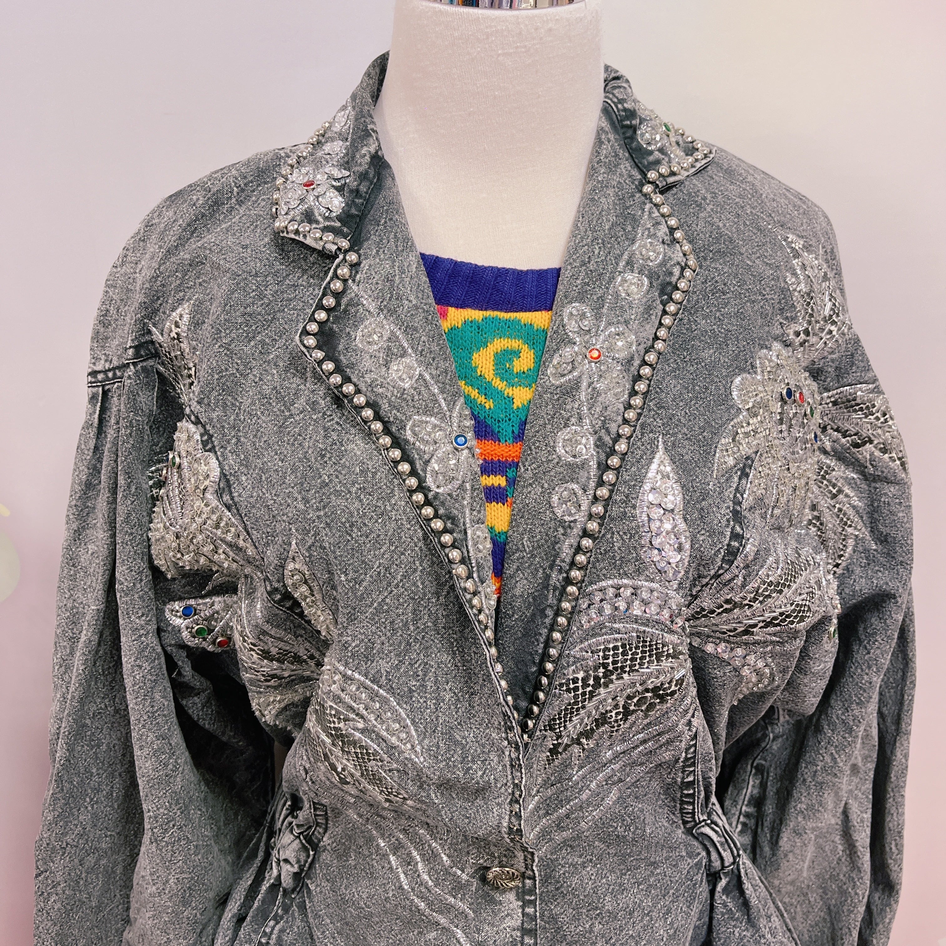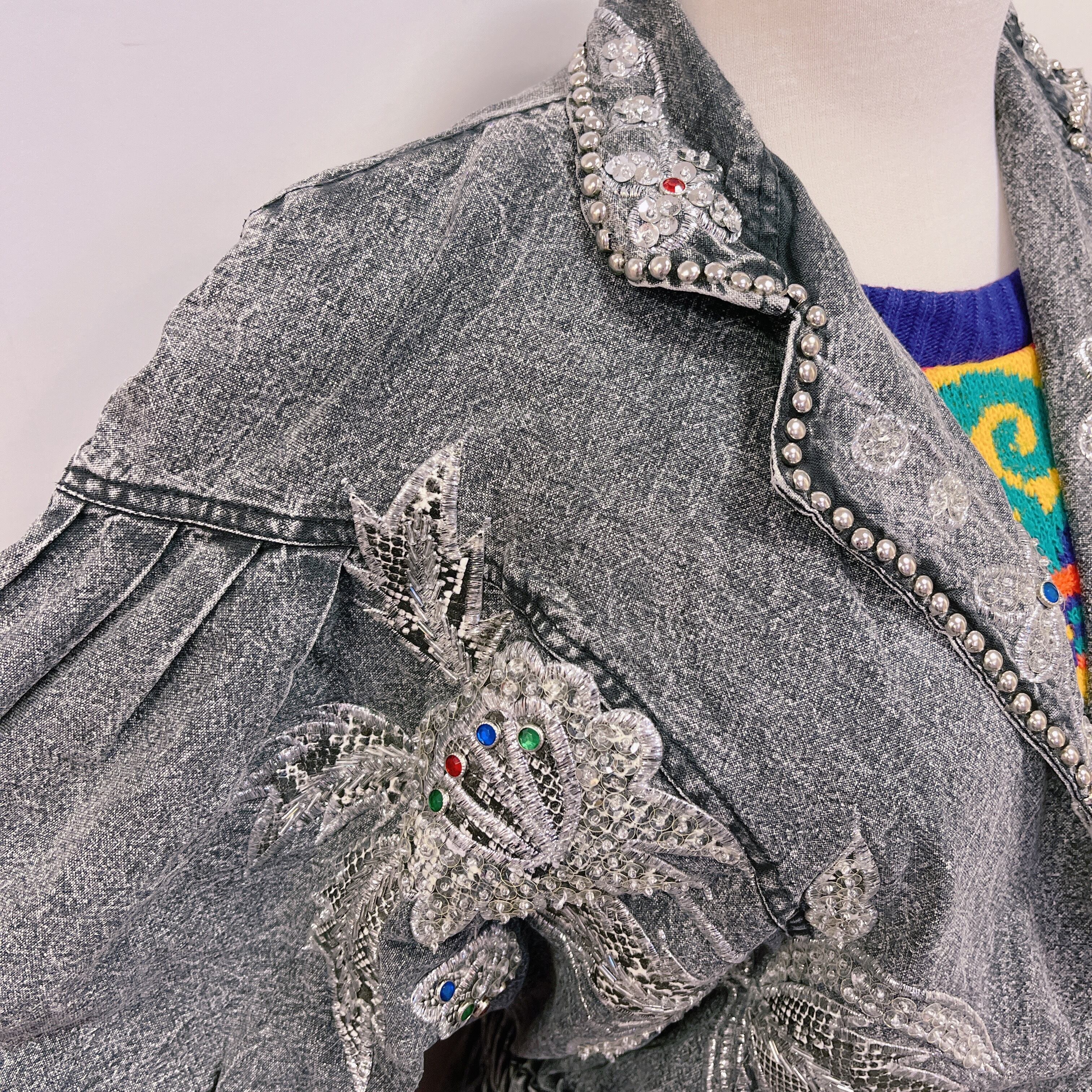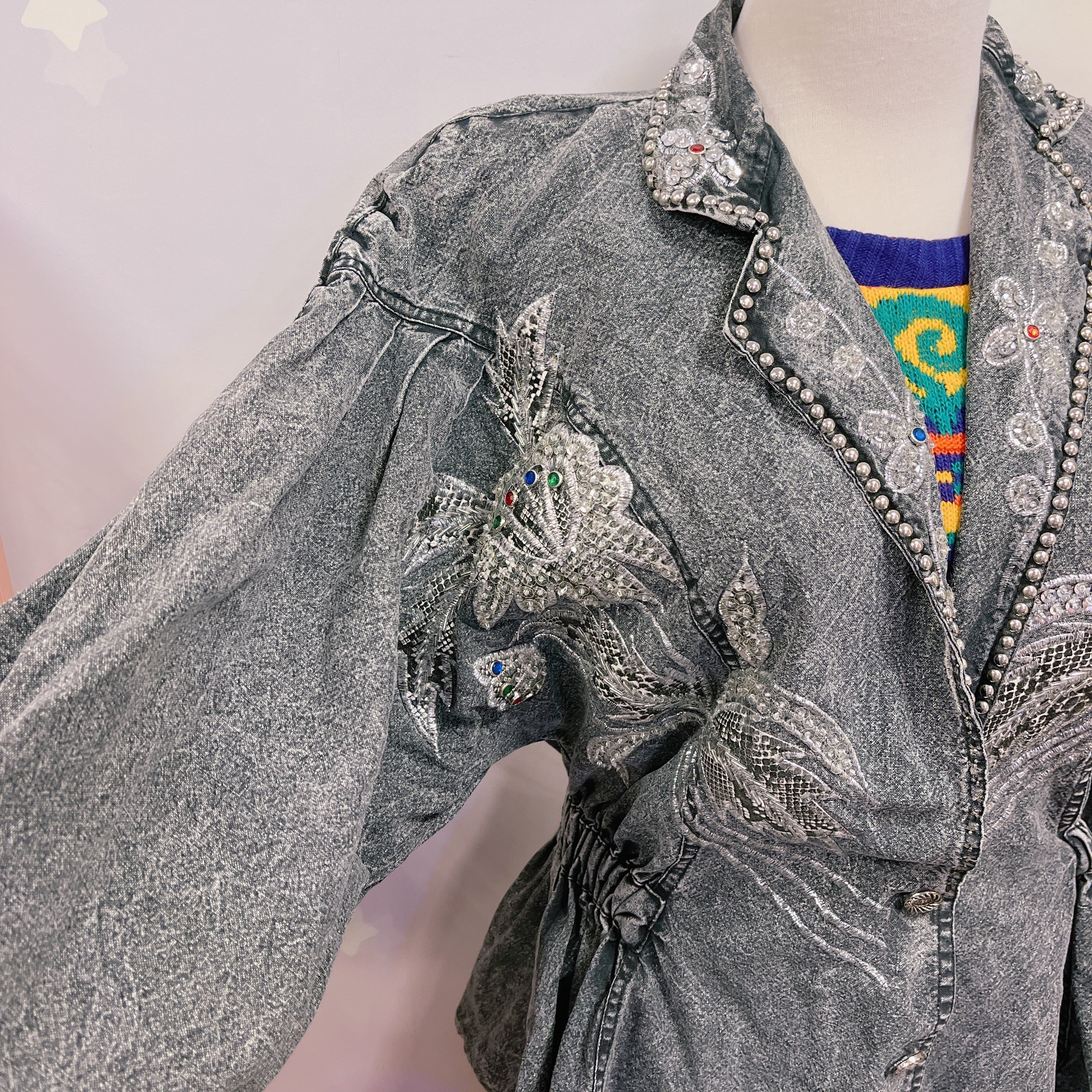 Vtg デニムジャケット 黒 スパン・ビーズ飾り