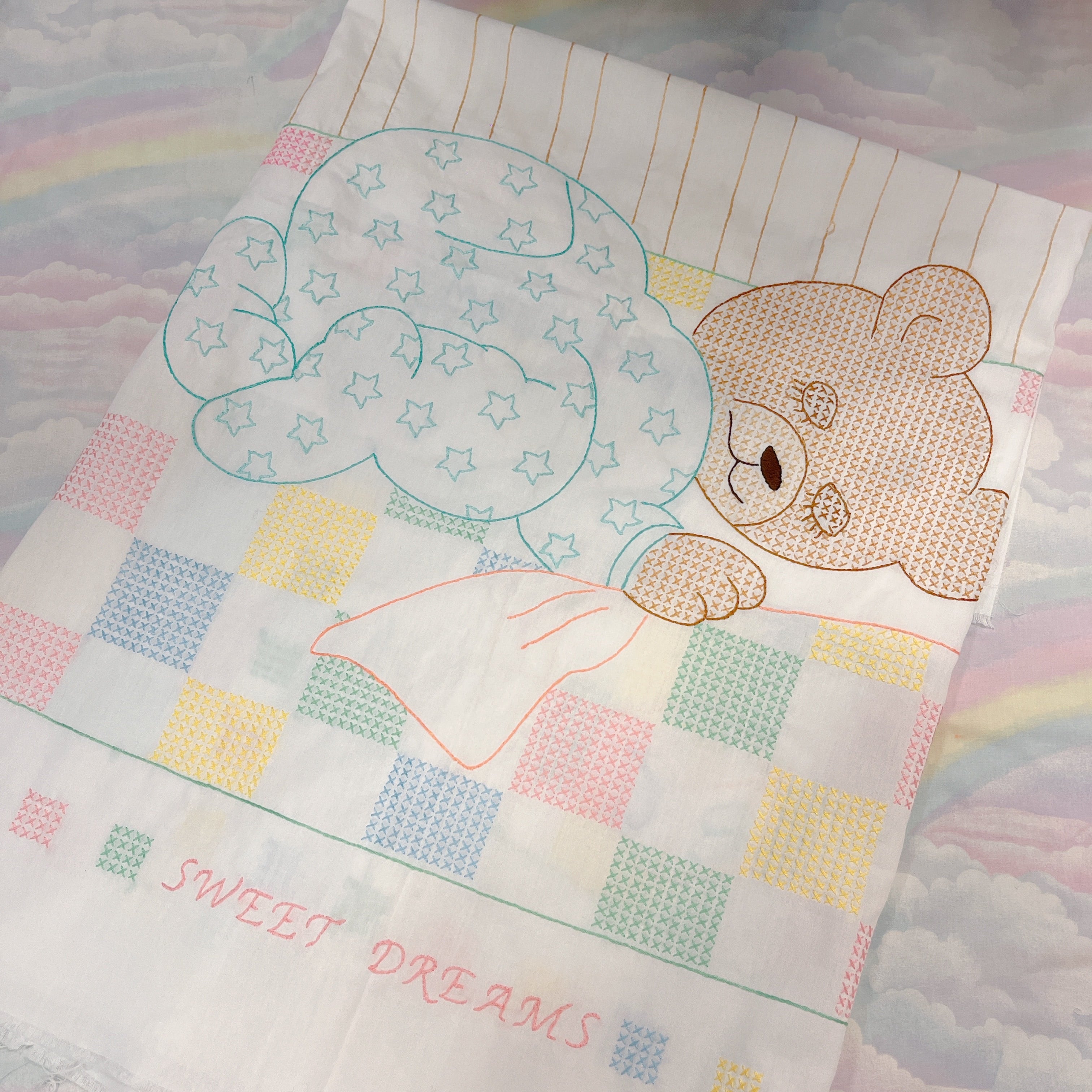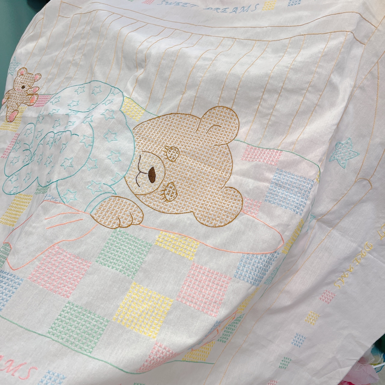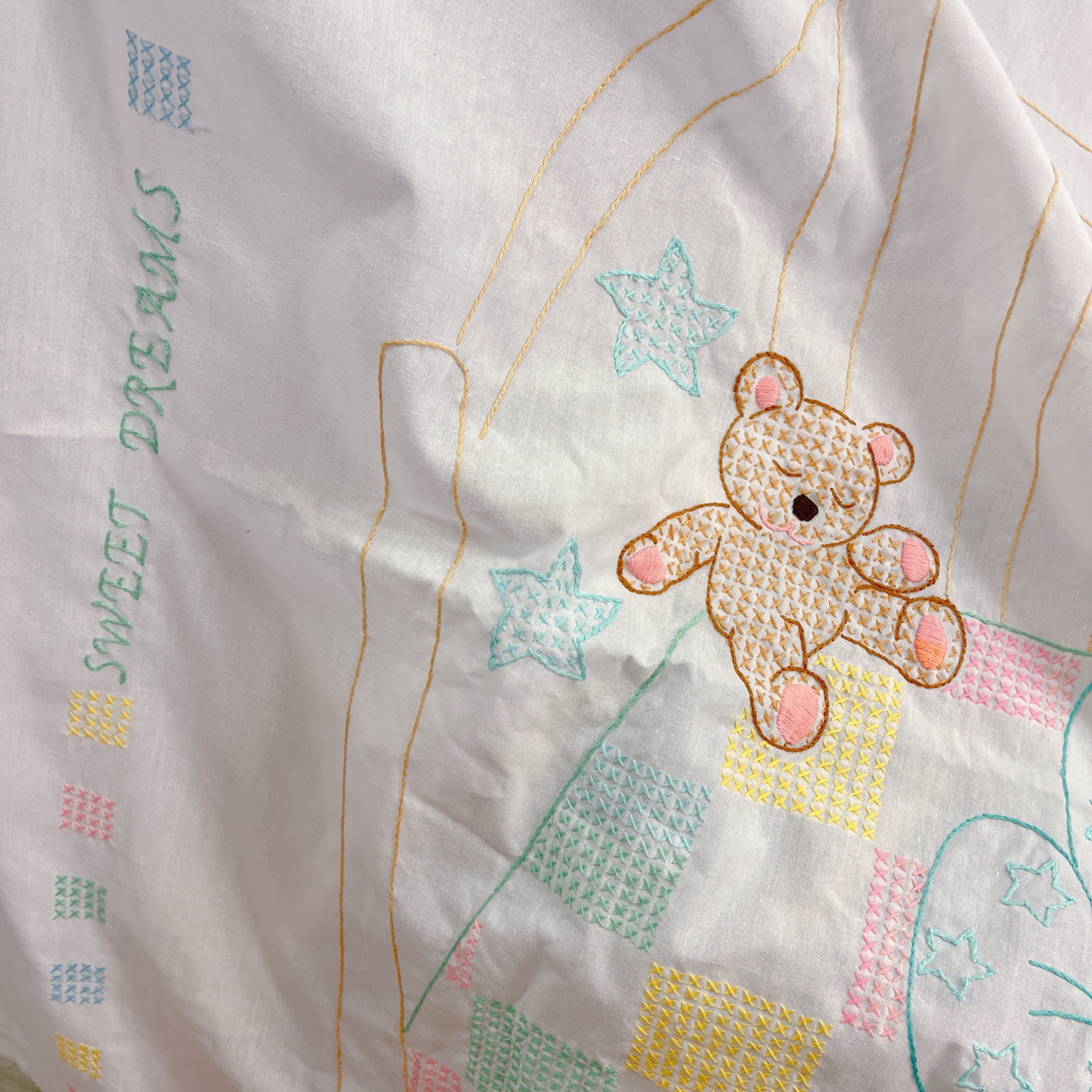 Vtg キルトトップ/生地 おやすみくま クロスステッチ
