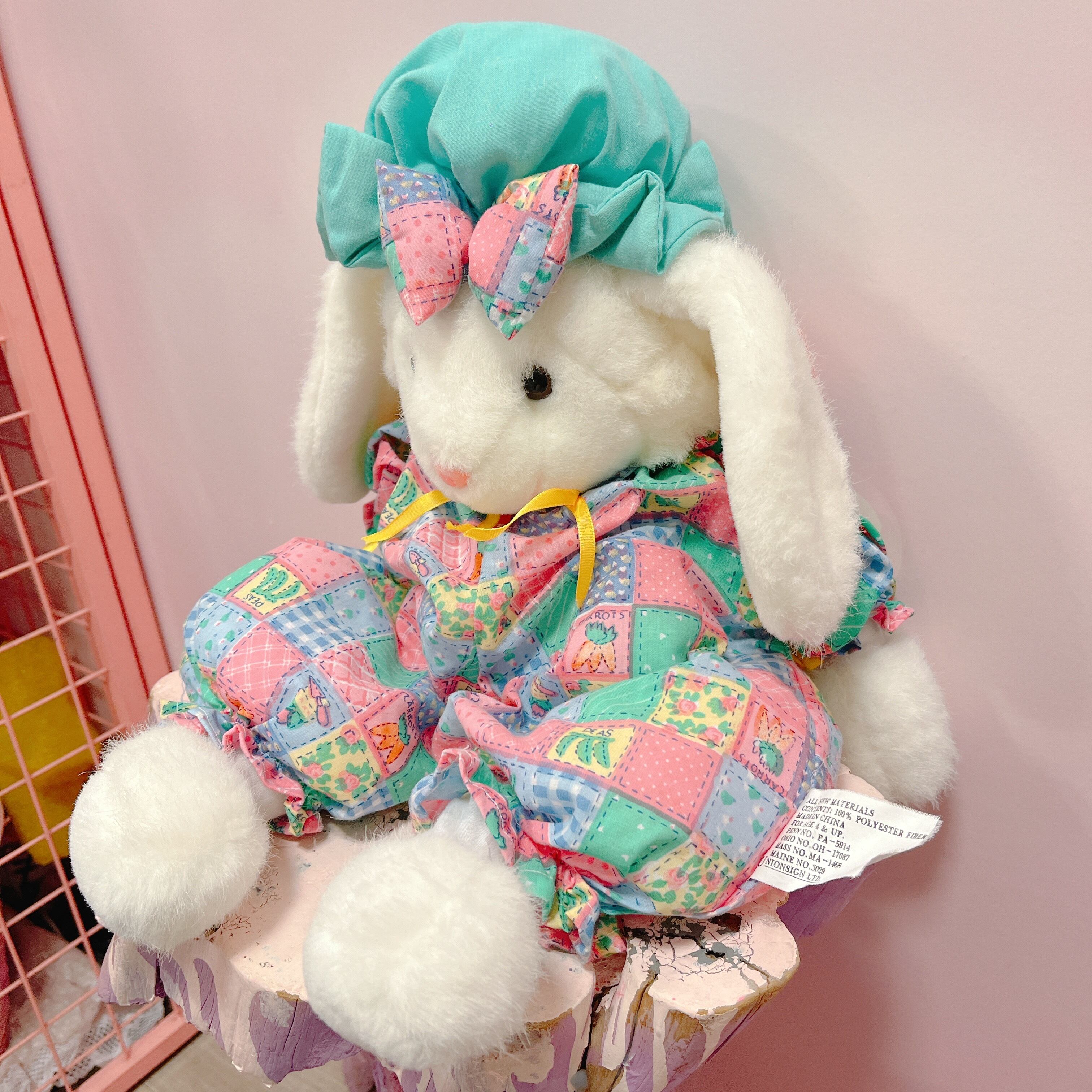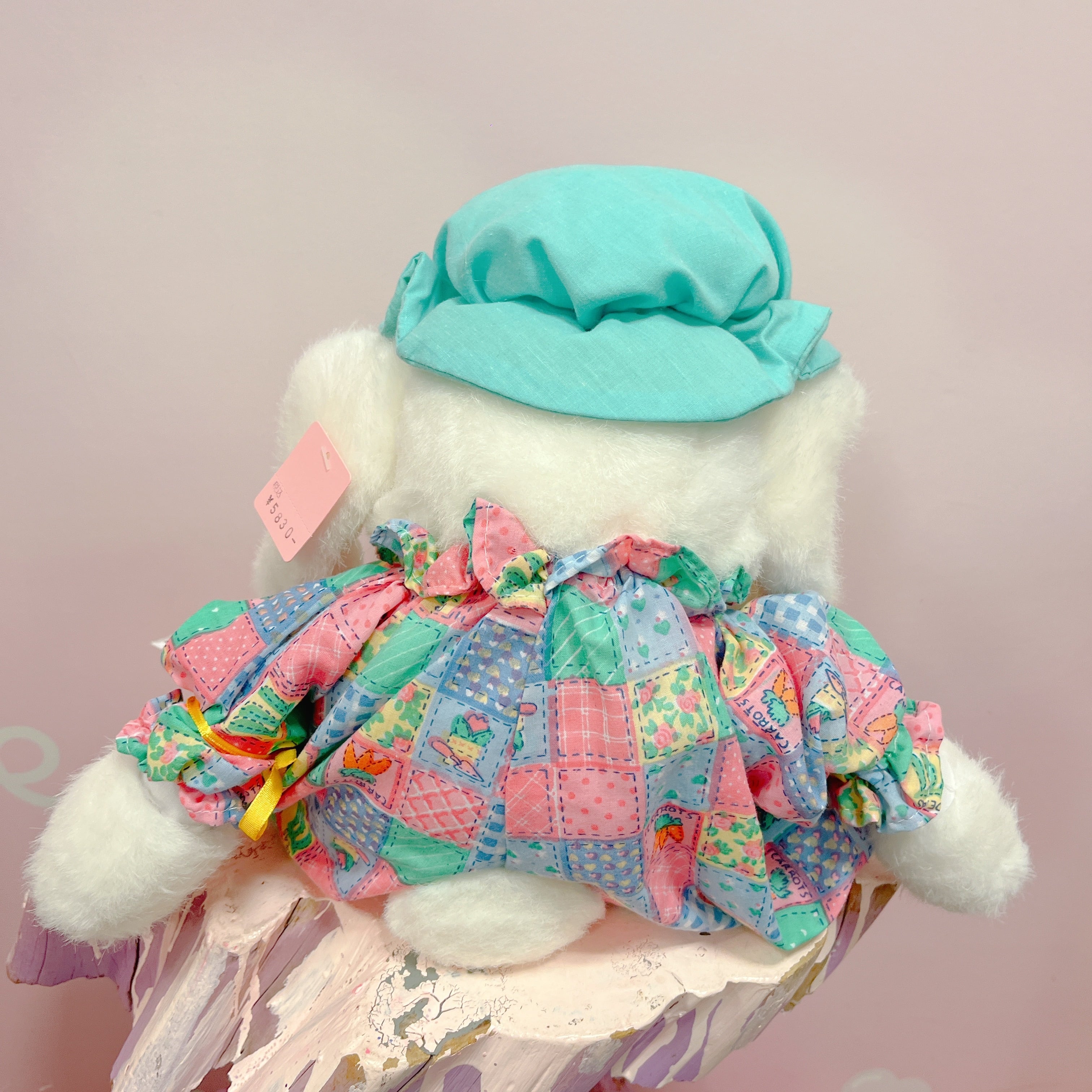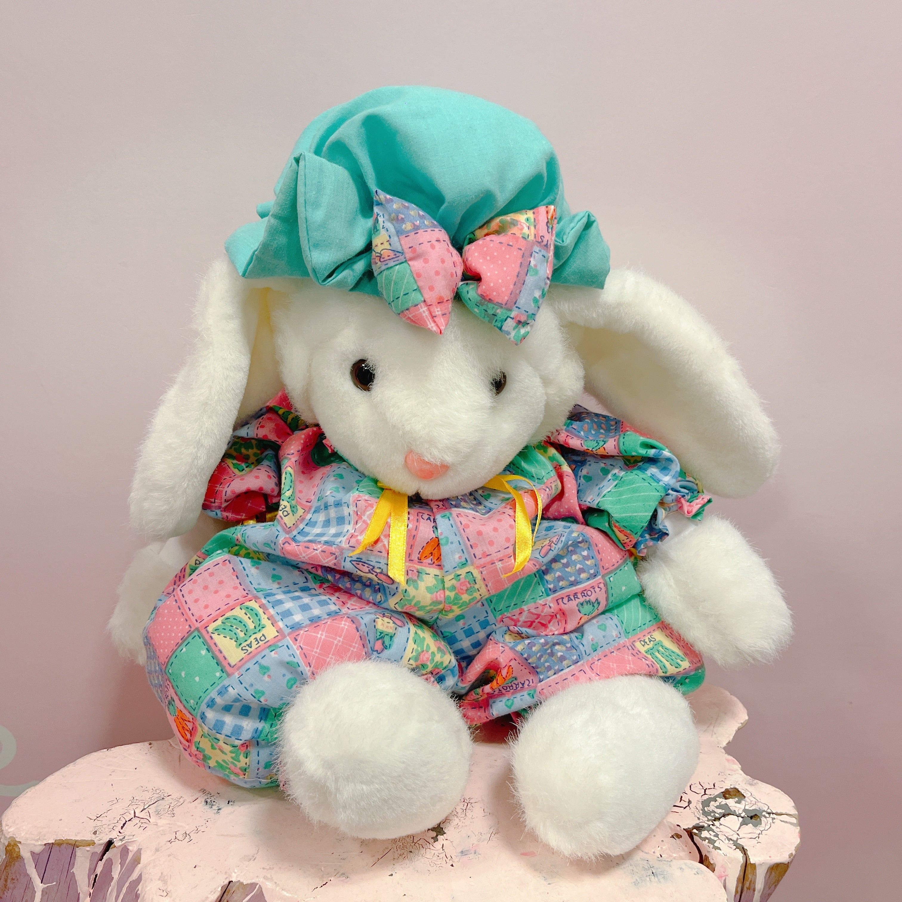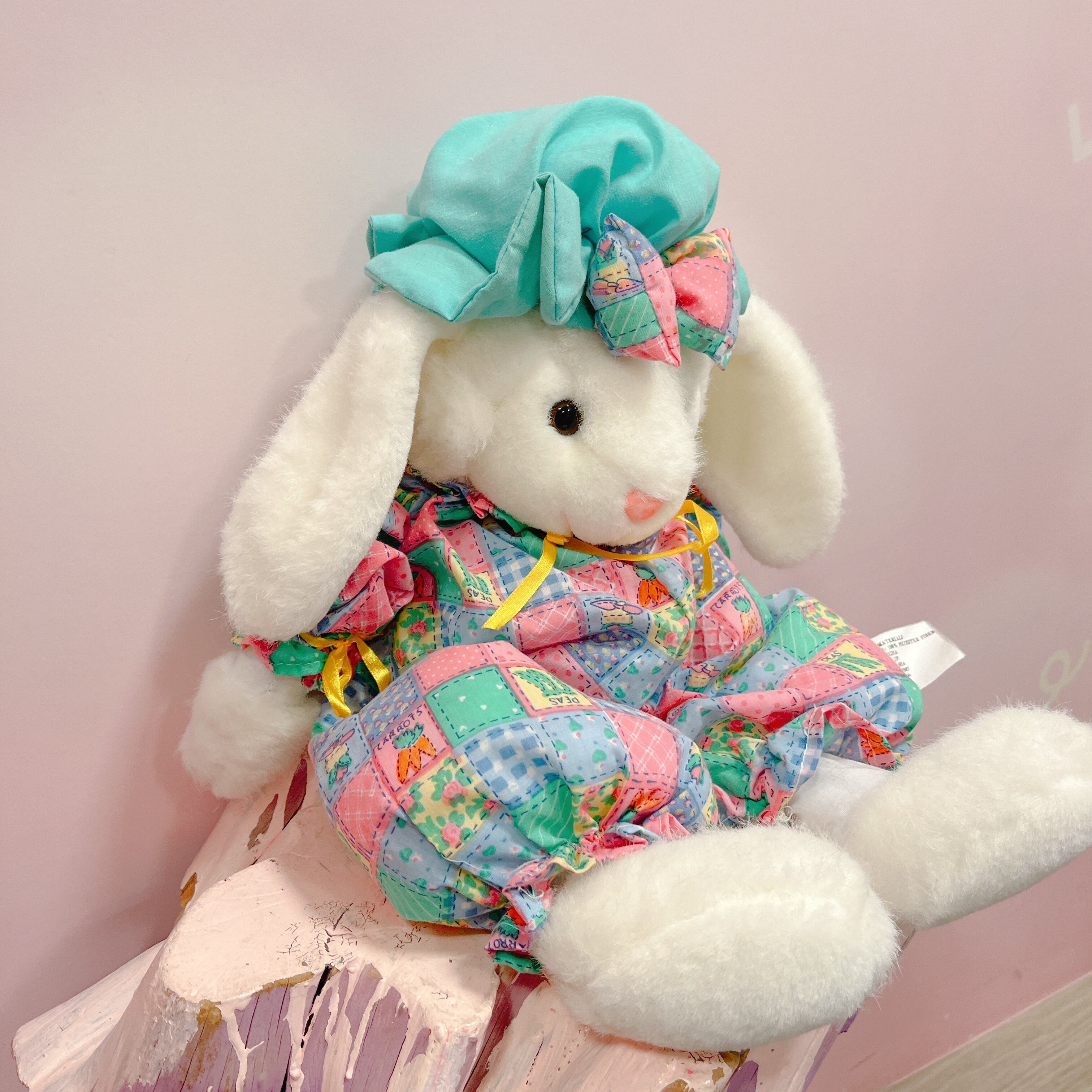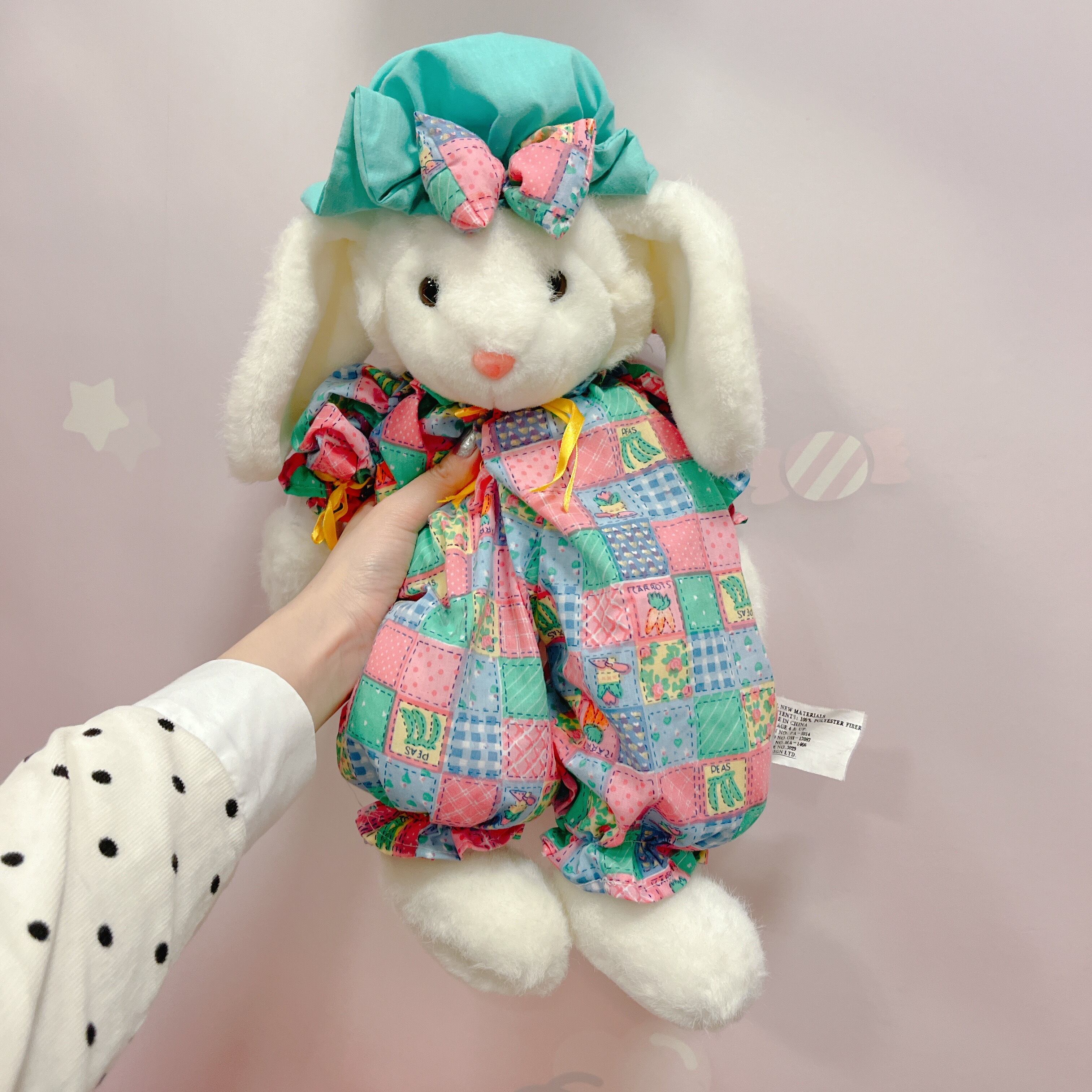 Vtg ぬいぐるみ 白うさぎ パッチワーク風ロンパース