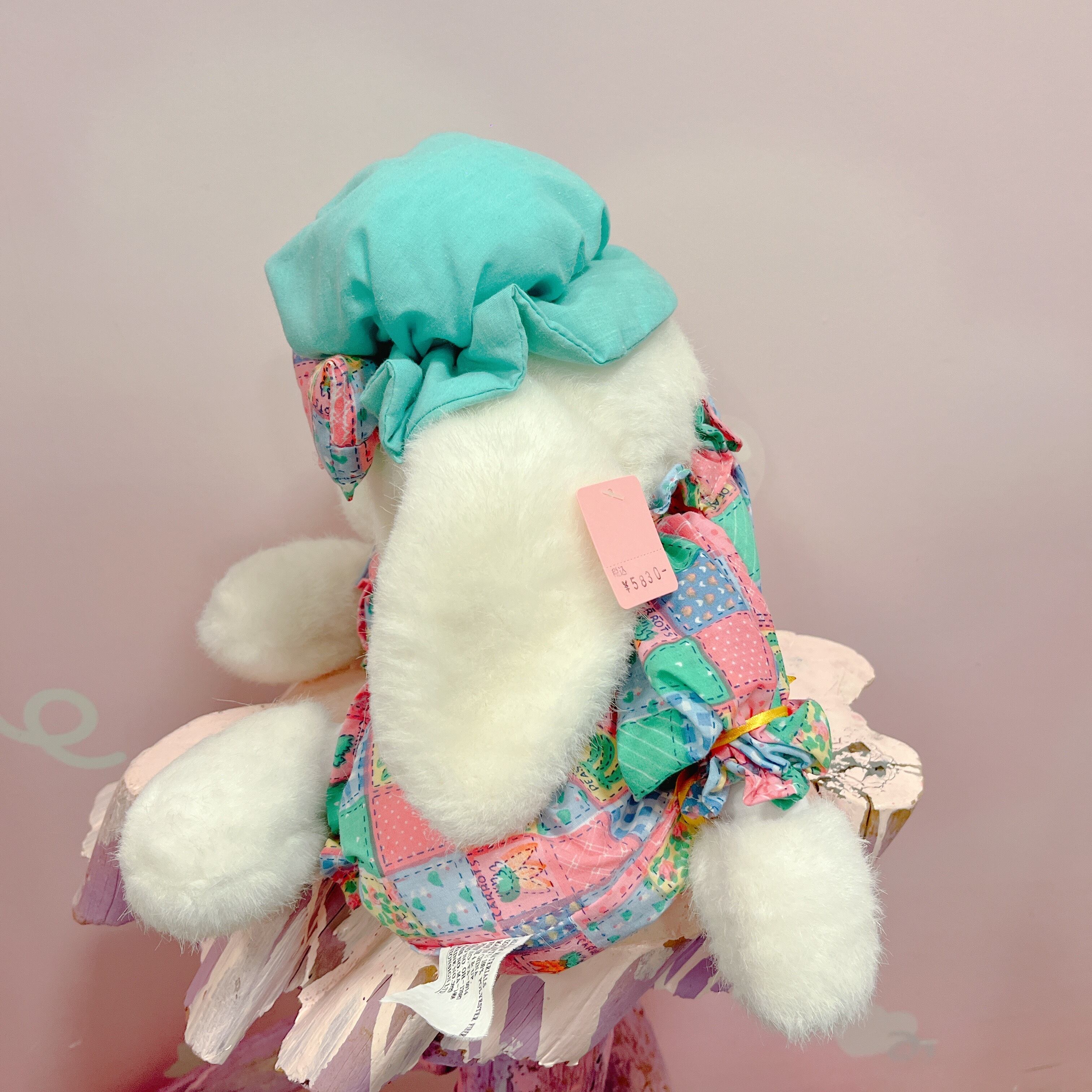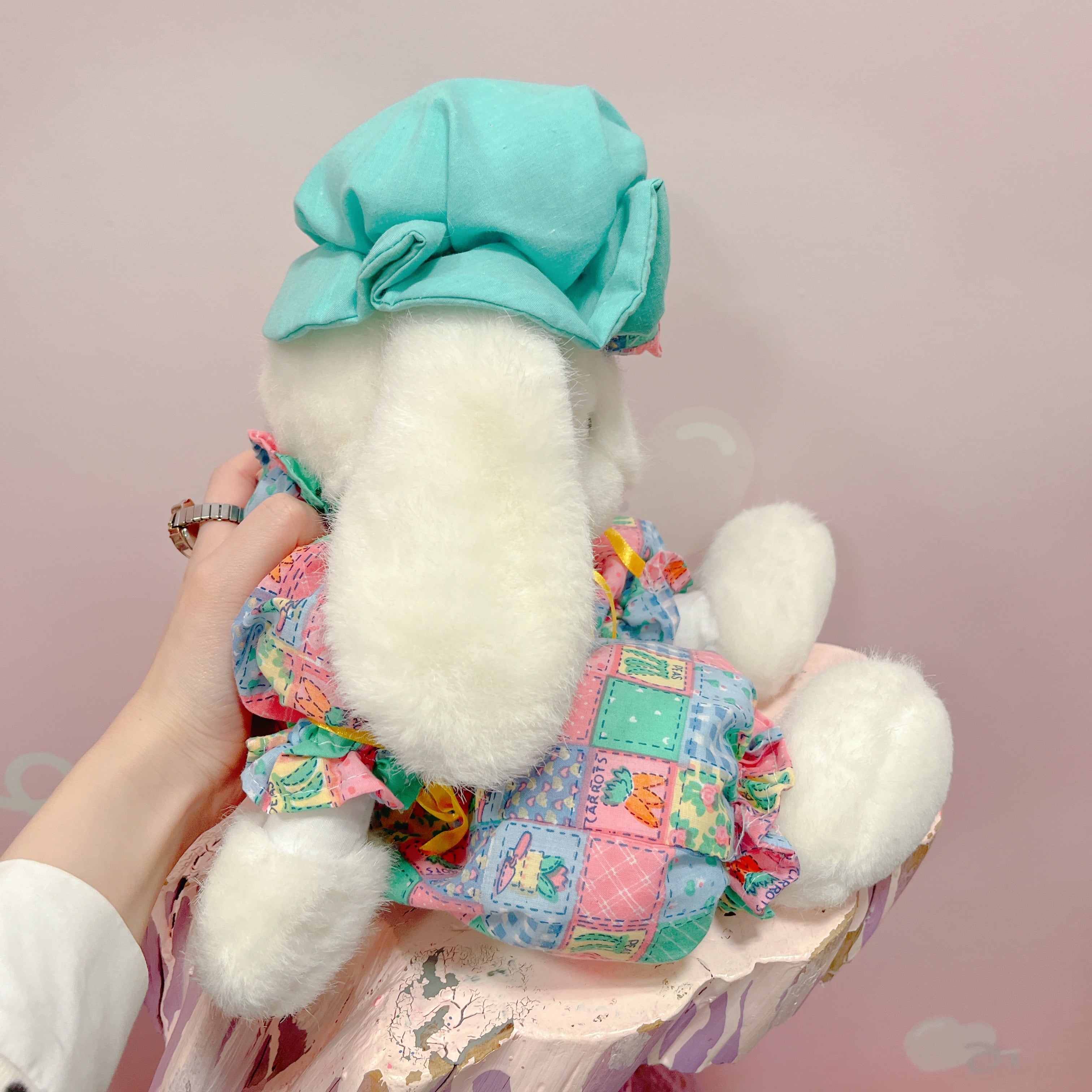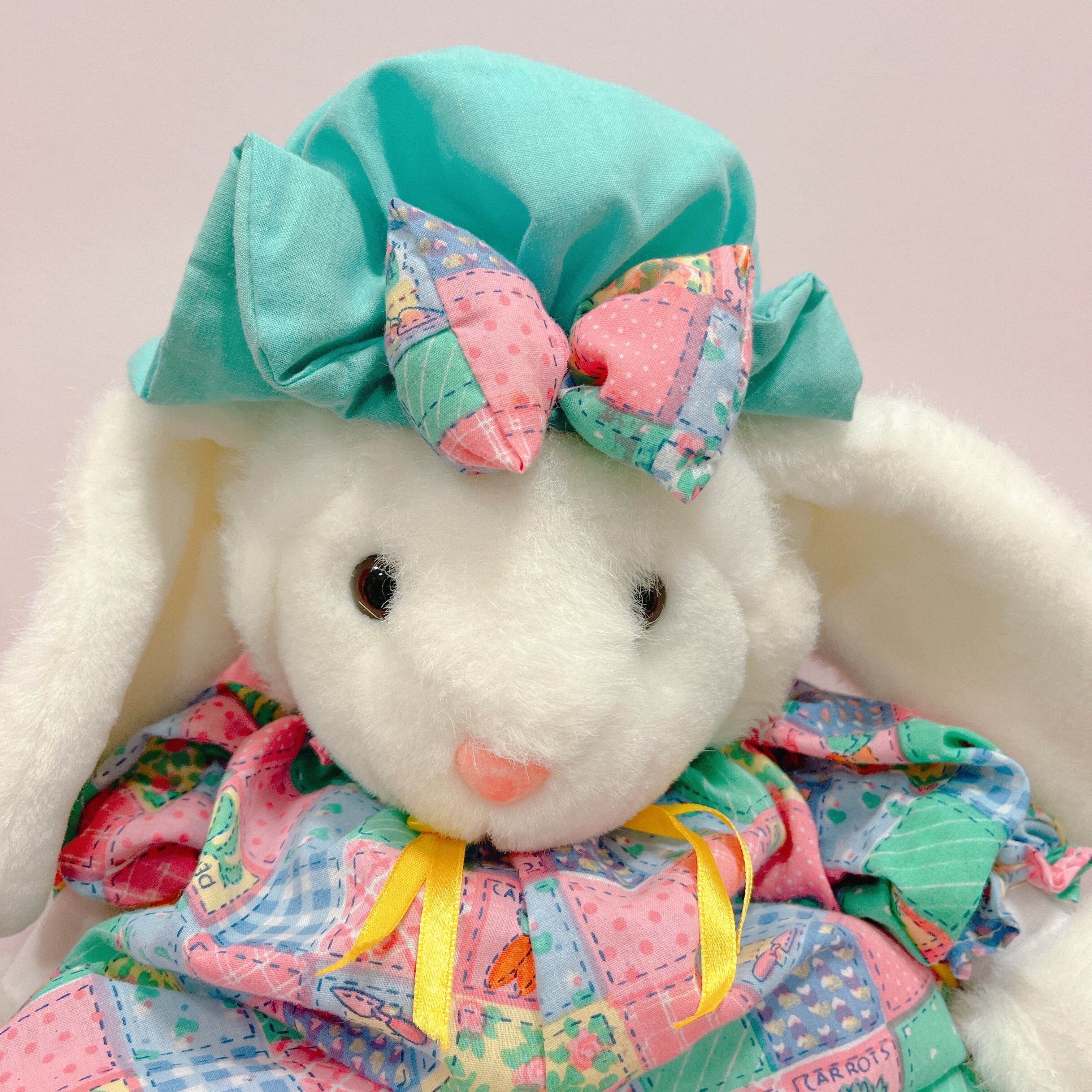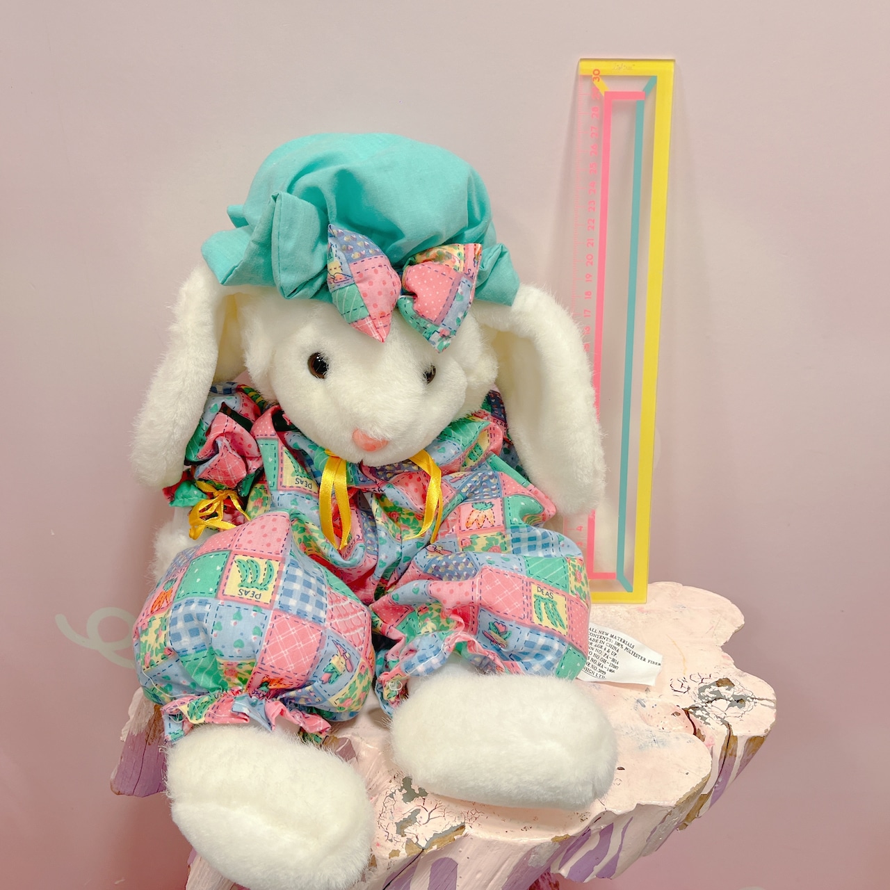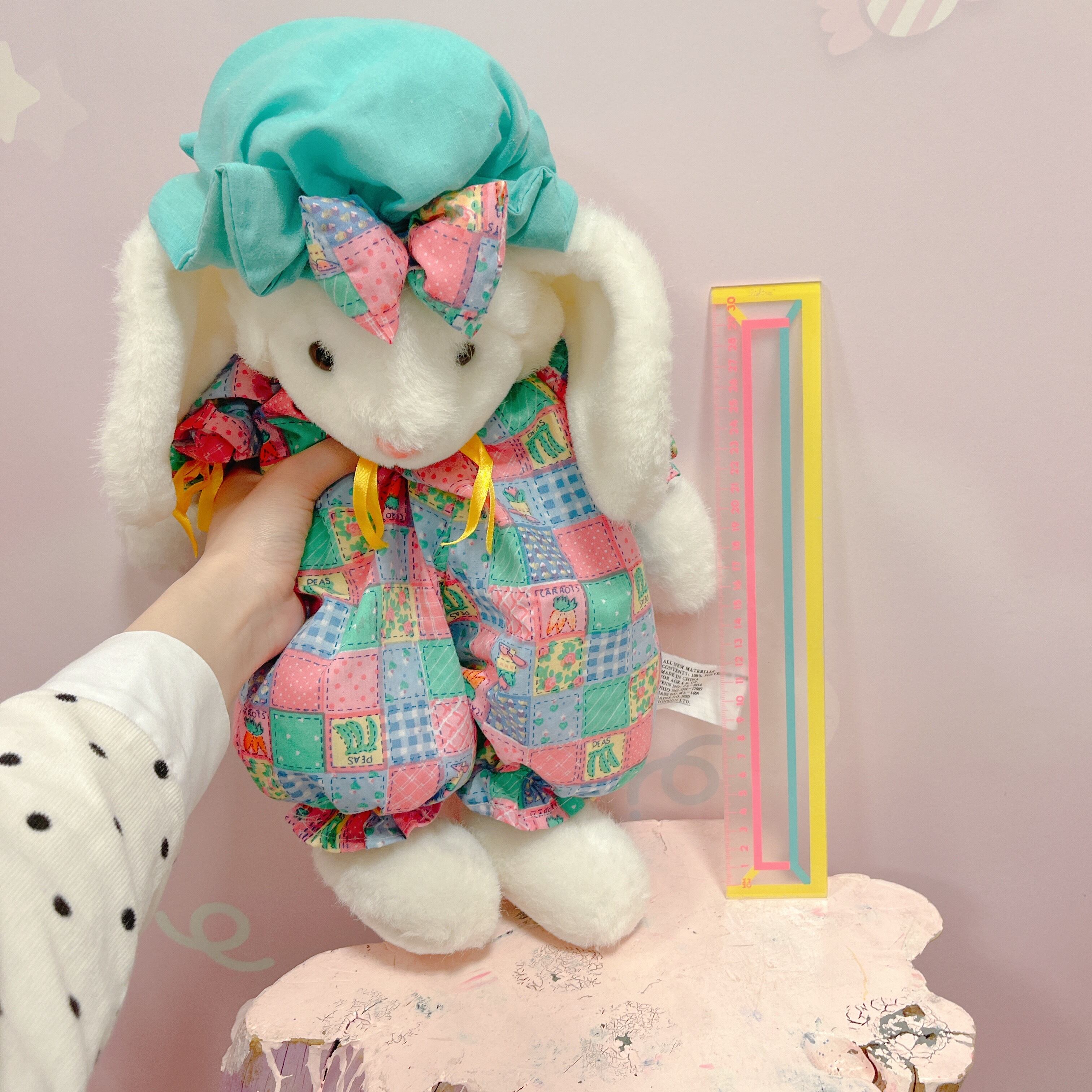 Vtg ぬいぐるみ 白うさぎ パッチワーク風ロンパース